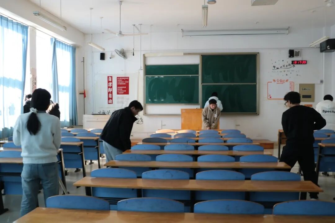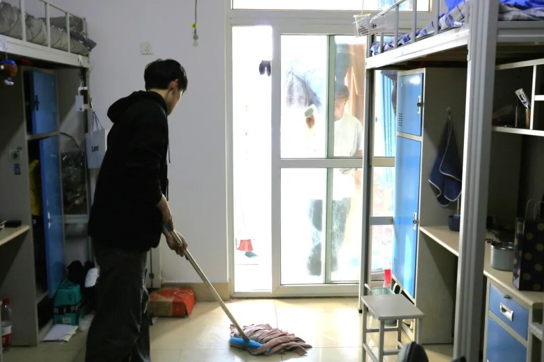 班会结束后,同学们主动行动起来,认真打扫宿舍与教室。大家分工协作、干劲十足:有的整理物品、收纳行李,让每一个角落井然有序;有的扫地拖地、擦拭桌椅窗台,不放过任何细节;还有同学主动检查电源、水龙头是否关闭,轻轻卷起铺盖,默默排查身边的安全隐患。在大家的共同努力下,宿舍焕然一新,教室明亮如初,为这一学期画上了一个清新而温暖的句号。