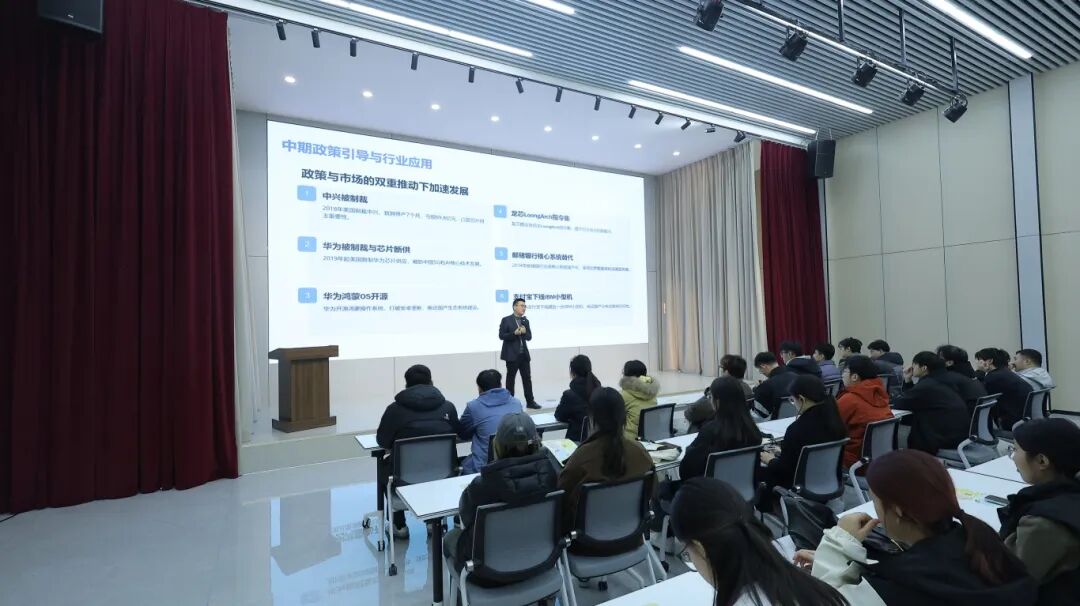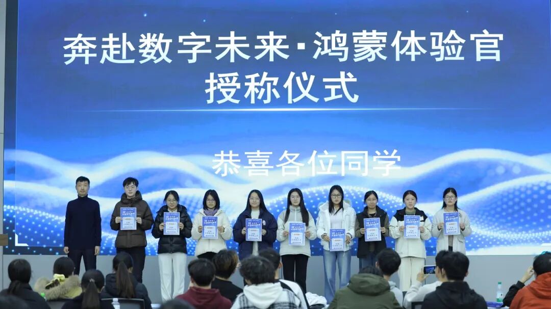 实训内容集理论分享、实操体验、趣味互动于一体的沉浸式学习场景,让前沿技术与学生职业发展无缝衔接。鸿蒙系统资深讲师带来的专题分享,从“南向硬件开发”到“北向应用开发”两大技术方向,系统解析了鸿蒙OS的核心架构、全场景应用及行业落地案例。结合智能交通、物联网等山东交通学院优势专业领域,让学生们直观感受到国产系统的技术实力与产业潜力。