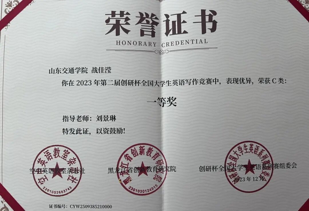2023年12月,获得第二届“创研杯”英语写作大赛国家级一等奖;