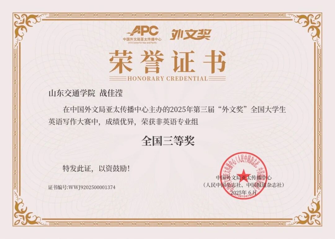2025年6月,获得第三届“外文奖”全国大学生英语写作大赛国家级三等奖;
