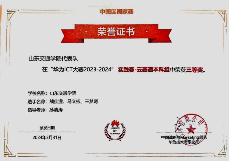 2024年3月,获得华为ICT大赛2023-2024中国区实践赛云赛道本科组国家级三等奖;