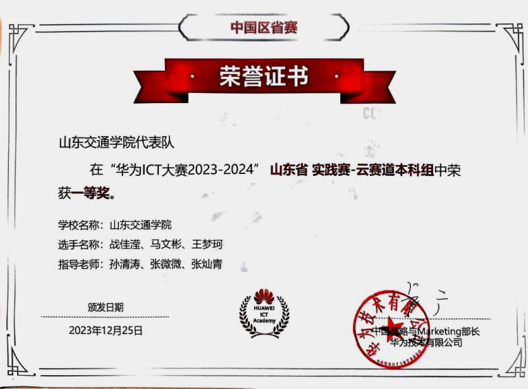 2023年12月,获得华为ICT大赛2023-2024中国区山东省实践赛一等奖;