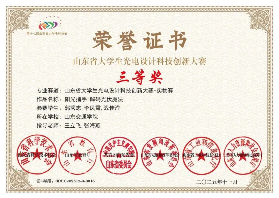 2025年11月,获得第八届山东省大学生光电设计科技创新大赛三等奖;