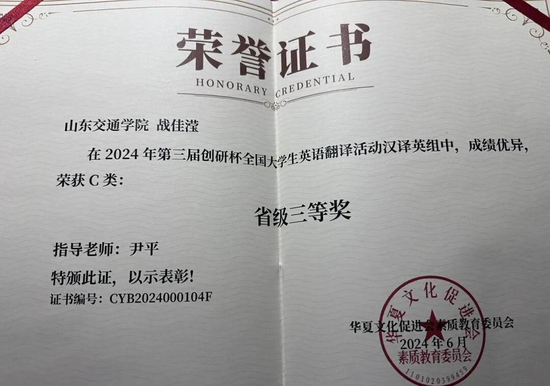2024年6月,获得第三届创研杯英语翻译比赛省级三等奖。