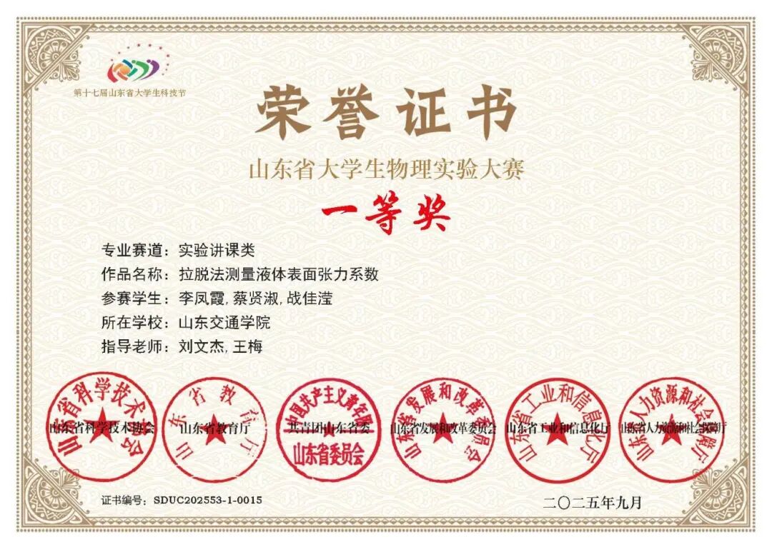 2025年9月,获得第十七届山东省大学生物理实验大赛省级一等奖;