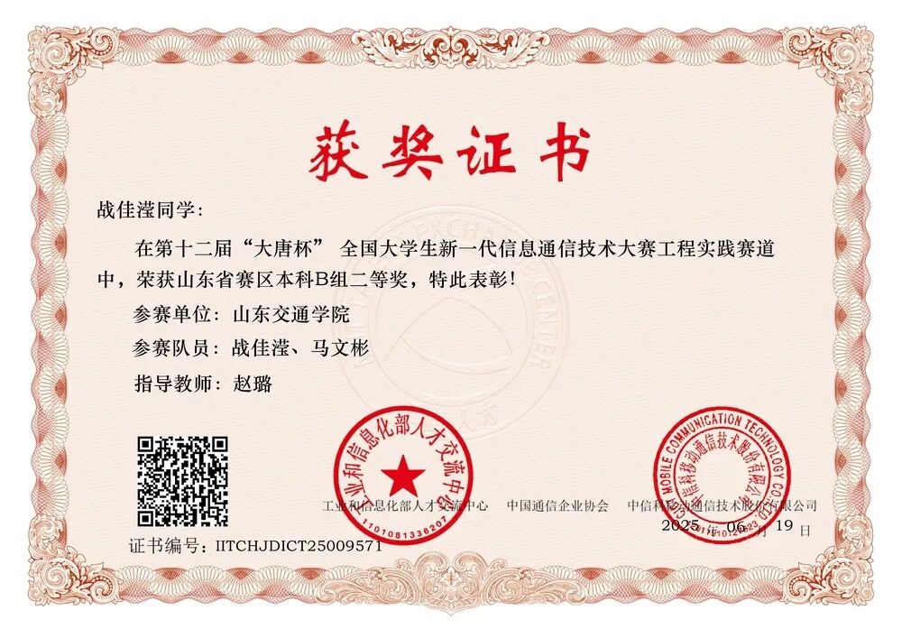 2025年6月,获得第十二届“大唐杯”全国大学生移动通信5G技术大赛山东省赛区本科B组二等奖;