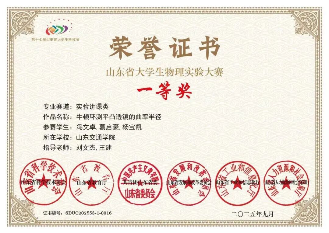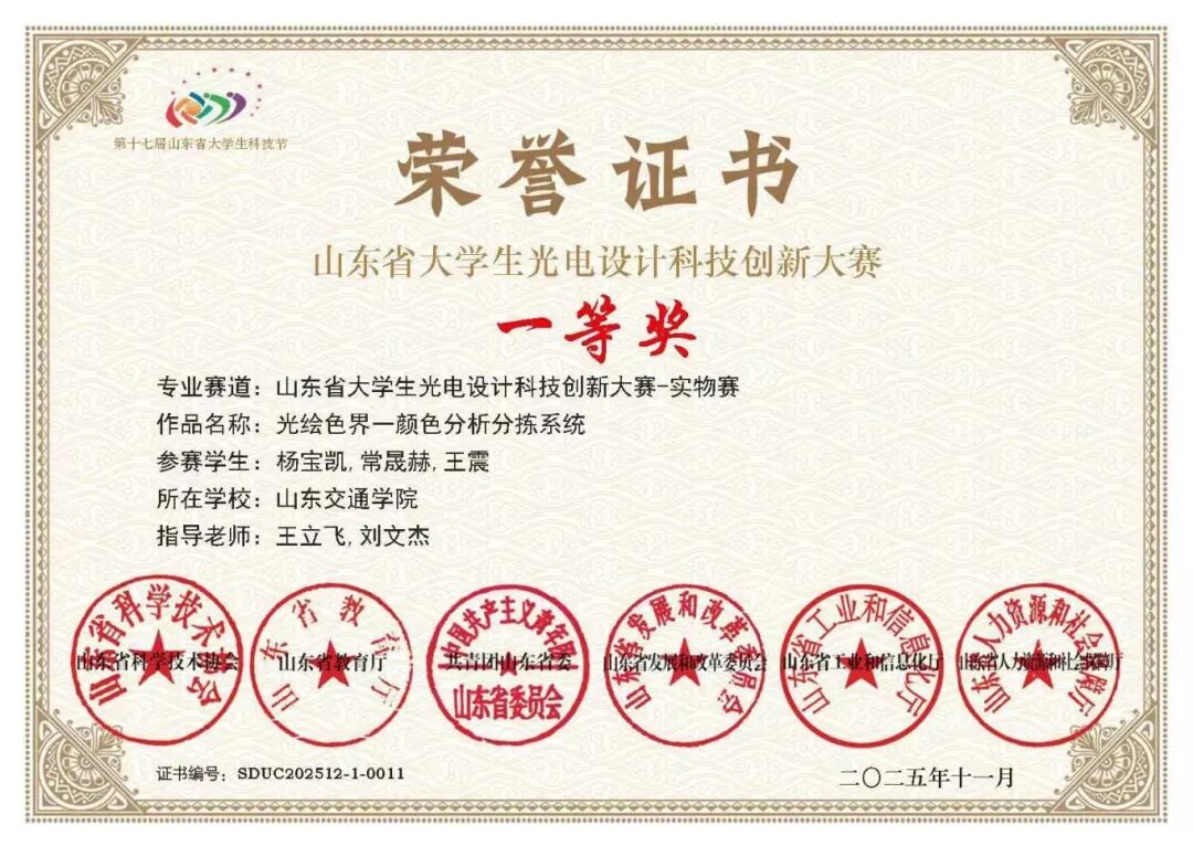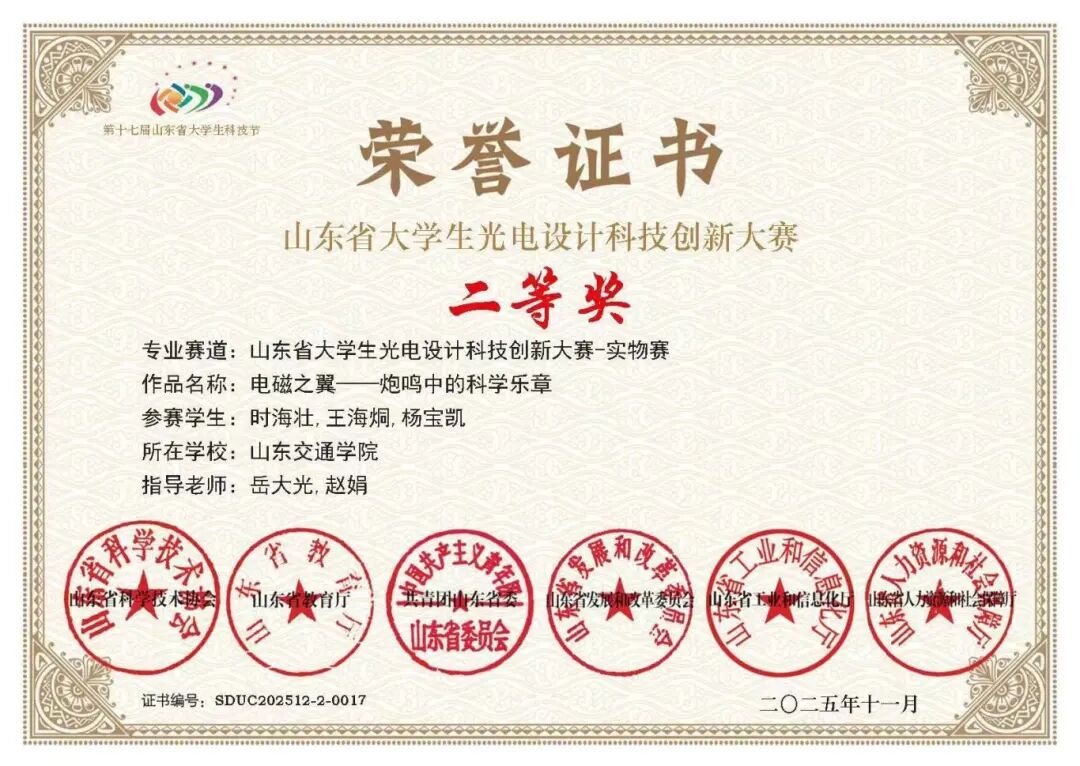 ●2025年8月获第十七届山东省光电设计竞赛省级一等奖一项,省级二等奖一项。