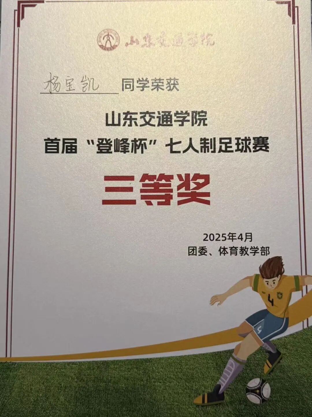 ●2025年4月,在“登峰杯”足球赛中,以队长身份带领团队荣获校级三等奖;