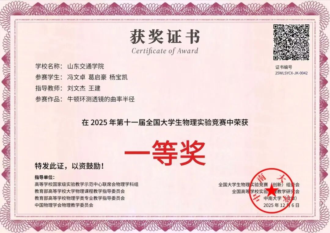●2025年12月获第十一届全国大学生物理实验竞赛国家级一等奖;