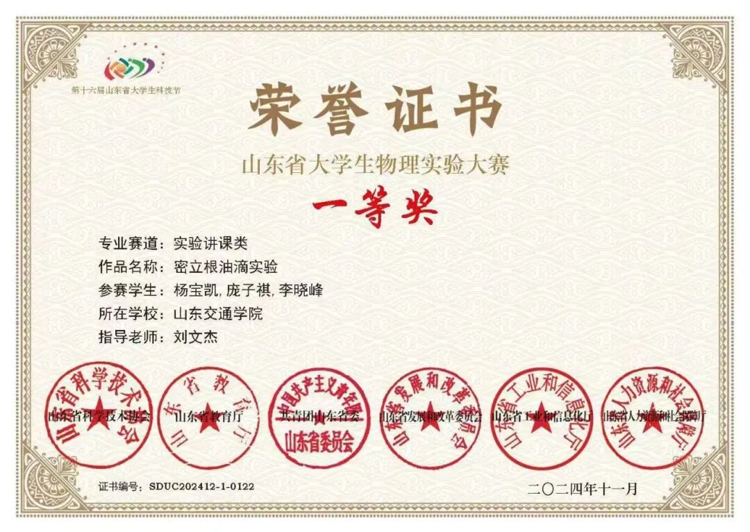 ●2025年8月获山东省物理实验大赛(讲课类)省级一等奖;