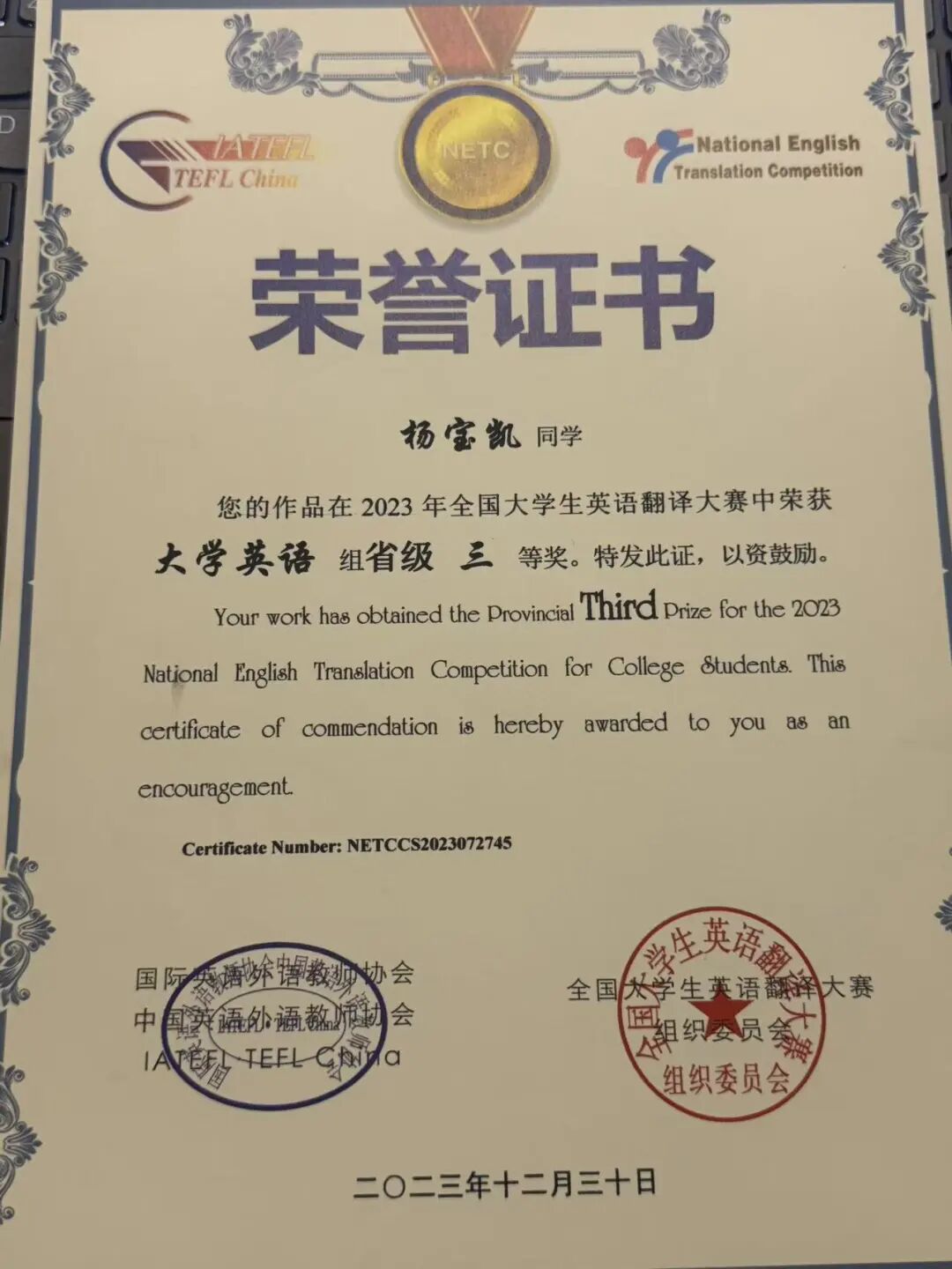●2023年12月获全国大学生英语翻译大赛省级三等奖;